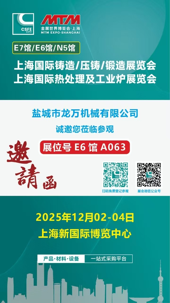 Yancheng Longwan Machinery Co., Ltd. participará en la “Exposición internacional de acero, fundición a presión y fundición a presión de Shanghai” y la “Exposición internacional de hornos industriales y tratamiento térmico de Shanghai” que se celebrarán en el Centro Internacional de Exposiciones de Shanghai del 2 al 4 de diciembre de 2025. Esta exposición atrae a numerosas empresas líderes de las industrias del acero, la fundición y el tratamiento térmico. Yancheng Longwan Machinery Co., Ltd. utilizará esta plataforma para mostrar sus últimas tecnologías y productos innovadores en el campo de la fabricación de maquinaria.